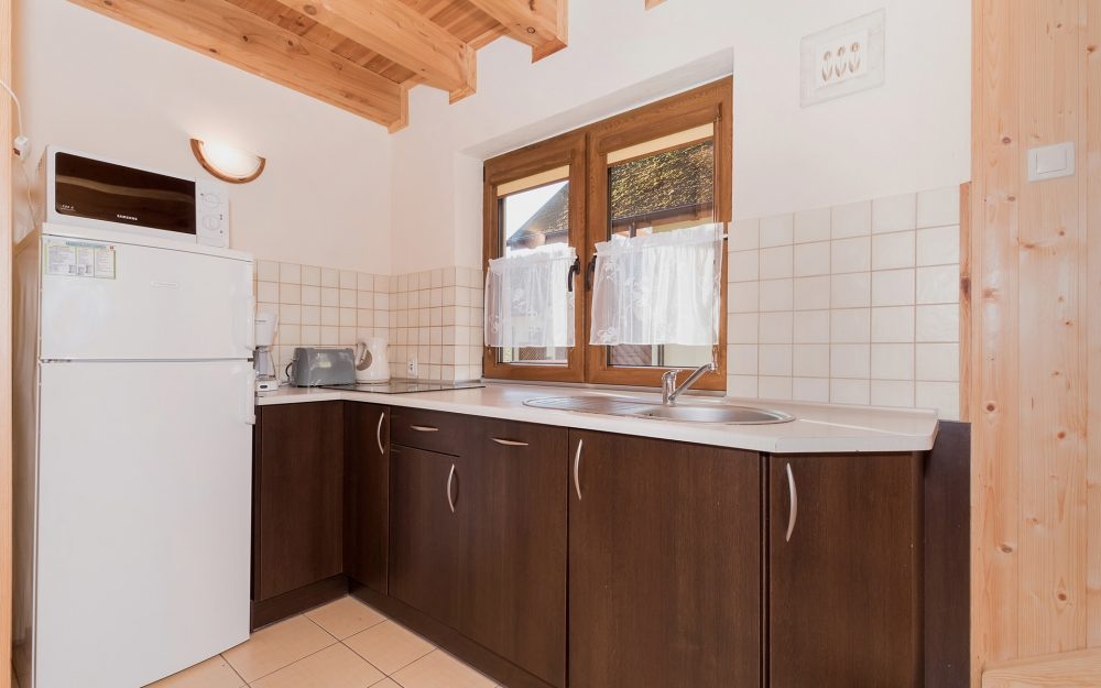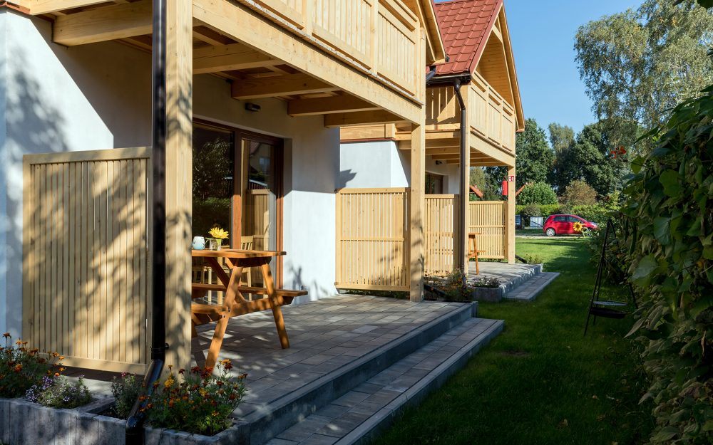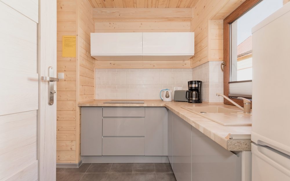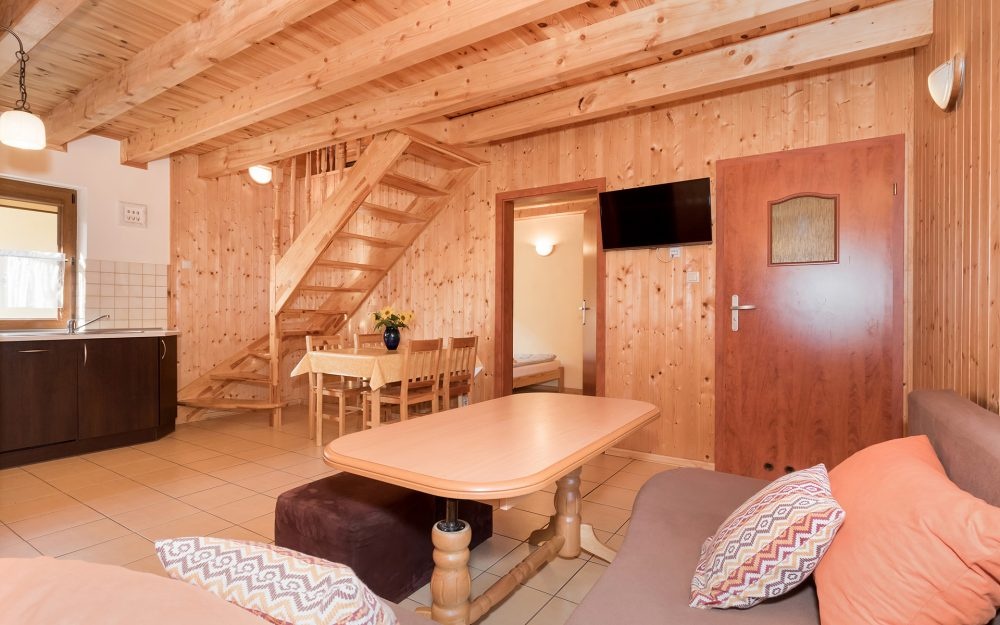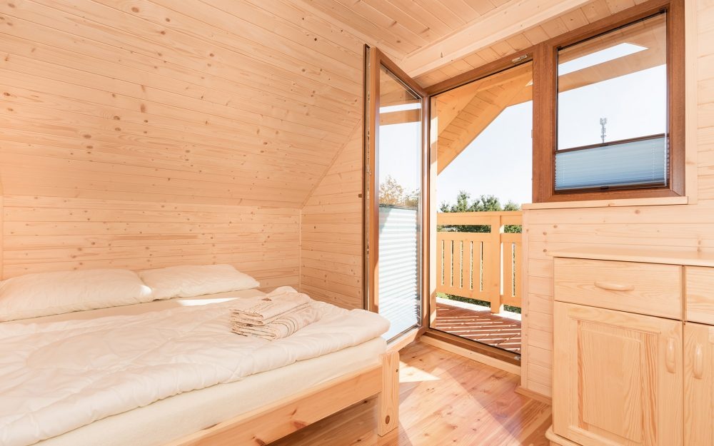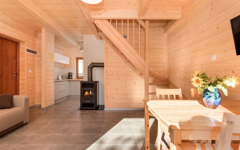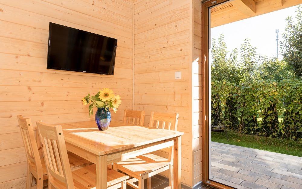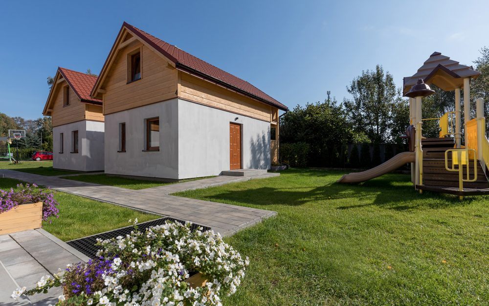 Każdy z domków jest w pełni wyposażony oraz pozwala na zakwaterowanie 6-8 osób. Dodatkowo przy domkach jest plac zabaw, miejsce do odpoczynku i grilla oraz bezpłatny parking.