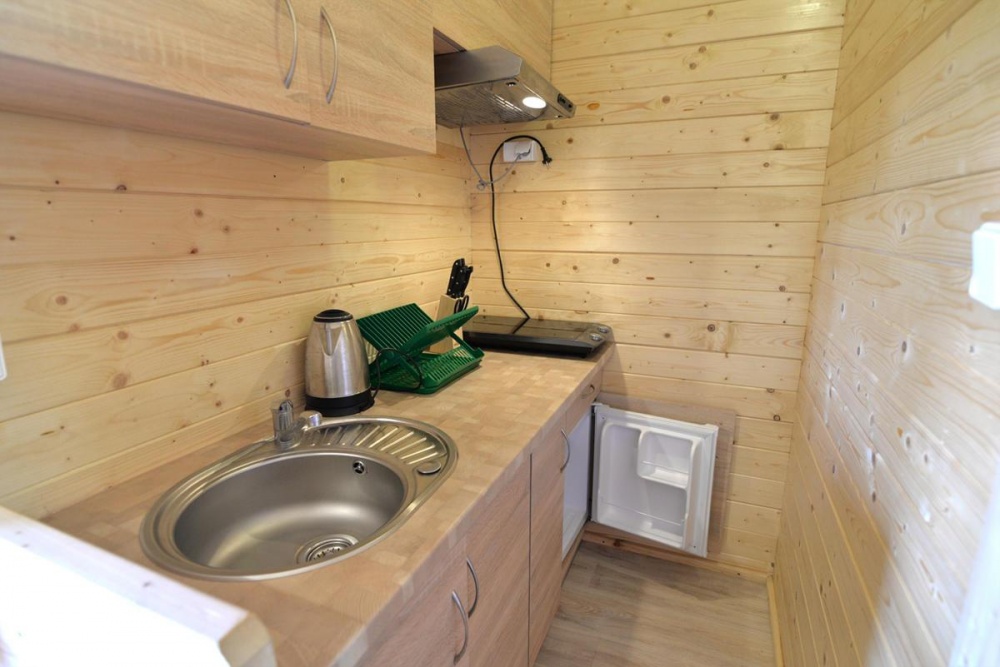 Drewniane domki letniskowe 5 osobowe składają się z dwóch sypialni i salonu z aneksem. W salonie znajduje się rozkładana kanapa, w sypialni łoże małżeńskie, a w drugiej piętrowe łóżko. Zapewniamy bezpieczny zamykany parking, miejsce do rekreacji, place zabaw.