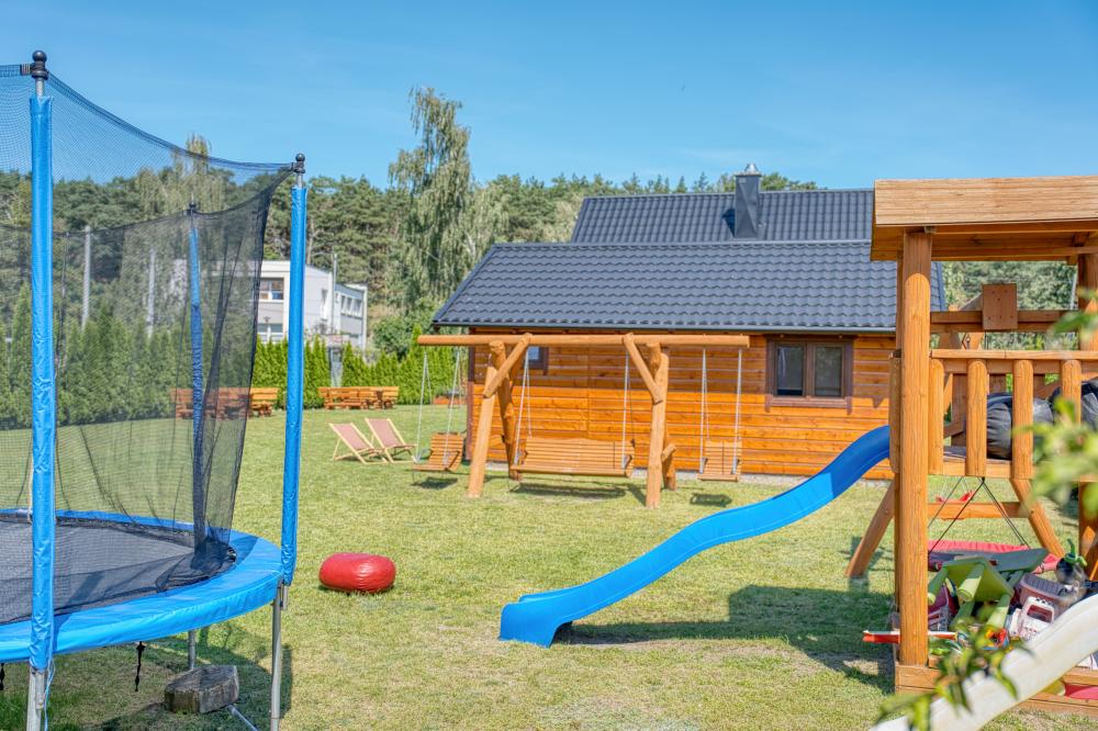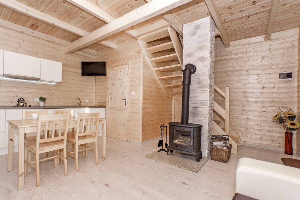 W Domkach całorocznych na parterze znajduje się duży salon z obszernym aneksem kuchennym zmywarka, mikrofalówka, lodówka, rozkładana sofa i klimatyczny kominek, który ogrzeje w chłodniejsze wieczory. Na piętrze znajdują się dwie sypialnie mniejsza łóżko podwójne, większa dwa pojedyncze i dwa podwójne.