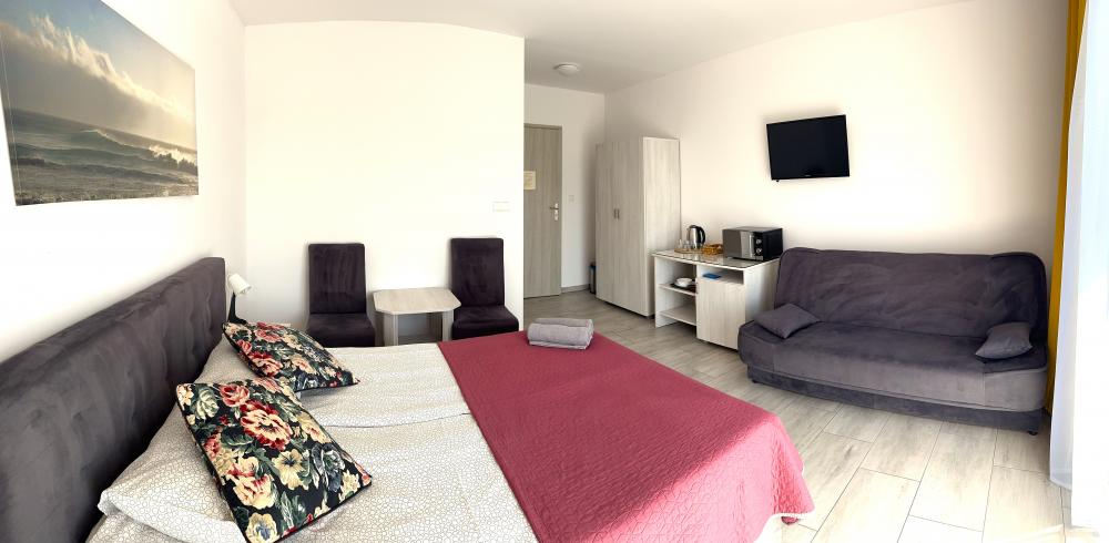 W pokoju: łazienka z kabiną prysznicową, łoże małżeńskie, rozkładana sofa, szafa, stolik, 2 foteliki, mini aneks kuchenny bez możliwości gotowania: lodówka, czajnik oraz mikrofalówka. W ofercie mamy pokoje 2, 3, 4 osobowe, istnieje możliwość dostawki w pokoju czteroosobowym.