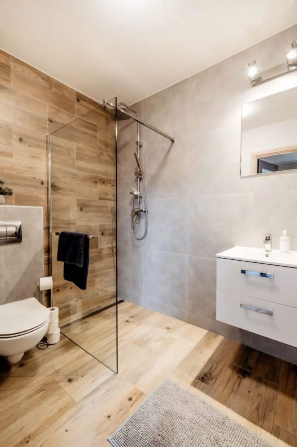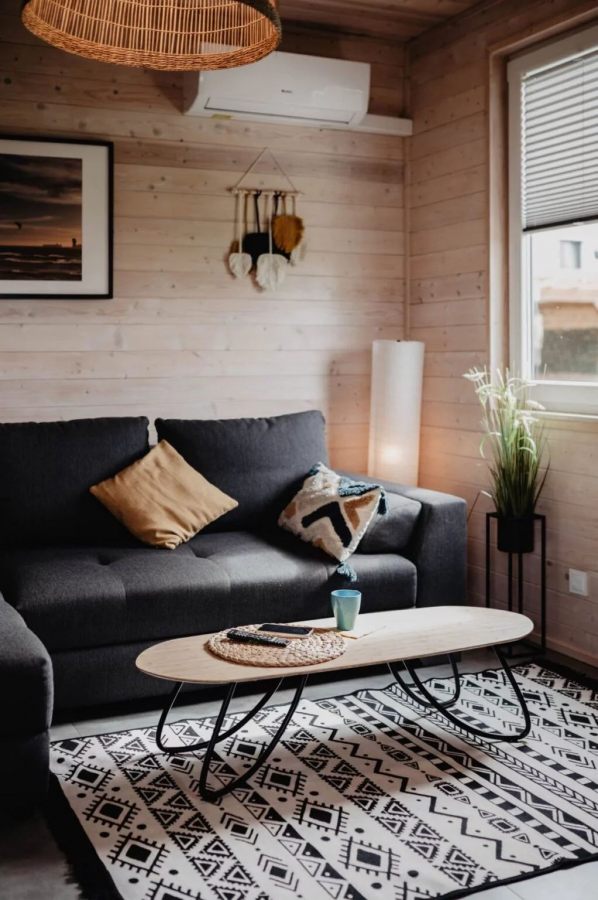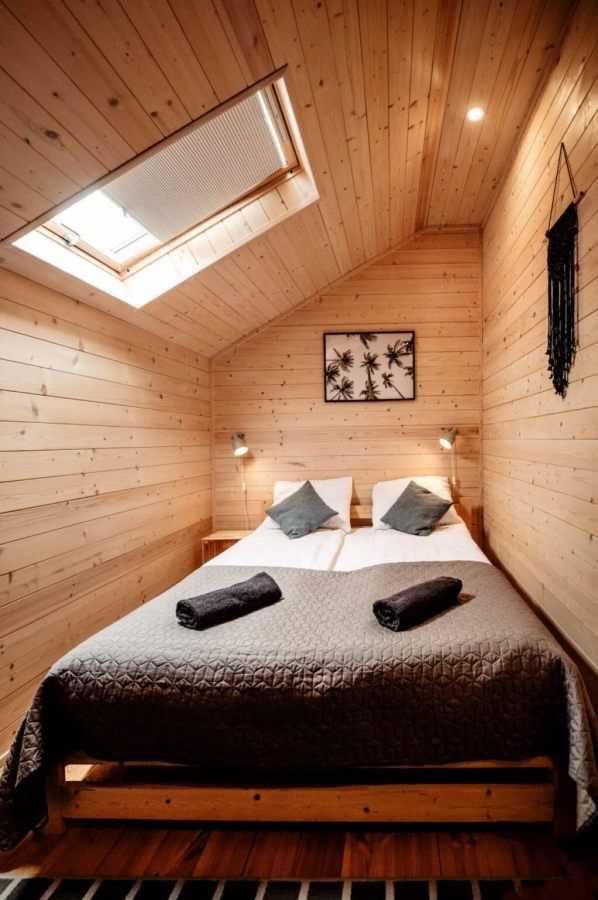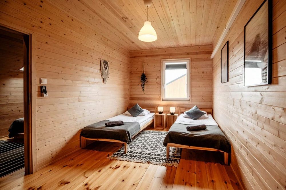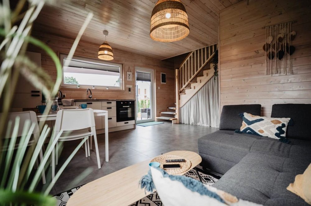 Na piętrze znajdują się dwie komfortowe sypialnie, jedna z łóżkiem podwójnym, a druga z dwoma pojedynczymi łóżkami, co czyni je idealnym miejscem na pobyt zarówno dla rodzin, jak i grup przyjaciół. Na parterze znajduje się przestronny salon z rozkładaną sofą pozwalającą na nocleg dodatkowym osobom.