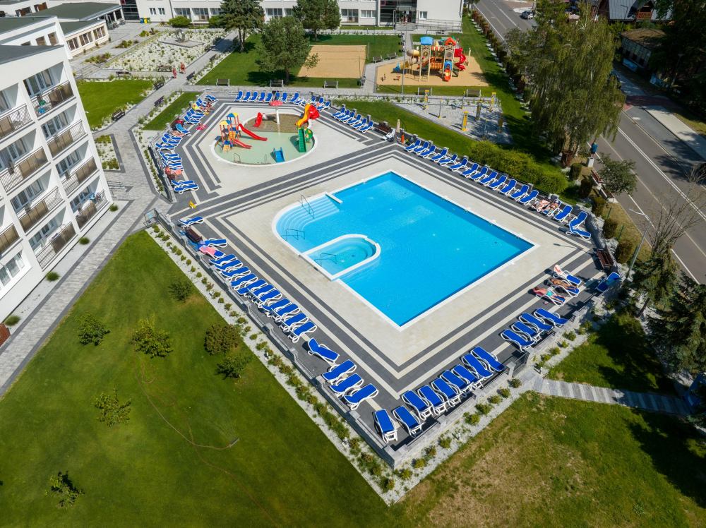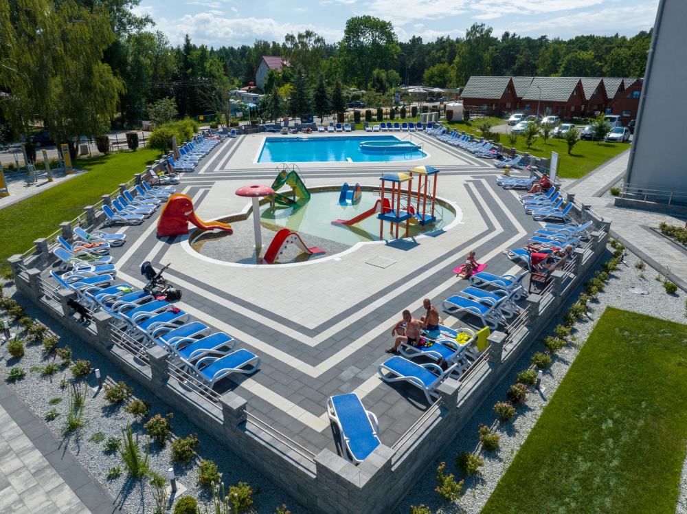 - baseny odkryte - jeden pływacki o wymiarach 15 m x 13 m, drugi basen dla dzieci z mini parkiem wodnym (czynne w okresie sezonu letniego - lipiec i sierpień),