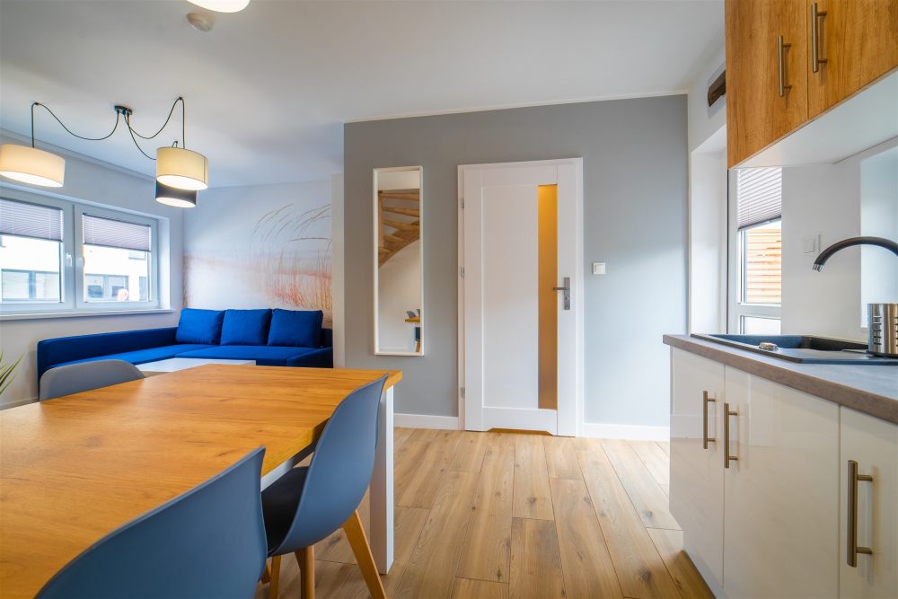Domki na parterze składają się z pokoju dziennego z aneksem kuchennym oraz łazienki. Na piętrze znajdują się dwie sypialnie oraz toaleta.