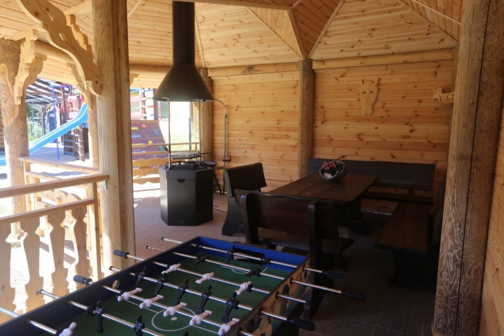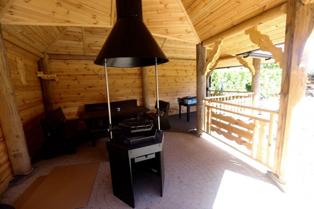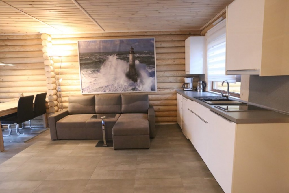 Na parterze domki posiadają wyposażony aneks kuchenny, połączony z miejscem do wypoczynku, nowoczesną łazienką oraz stołem, przy którym zjedzą Państwo rodzinne posiłki. Ponadto na parterze zlokalizowany jest taras z grillem gazowym, stołem i dwoma ławami.