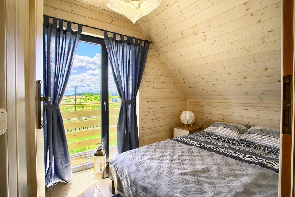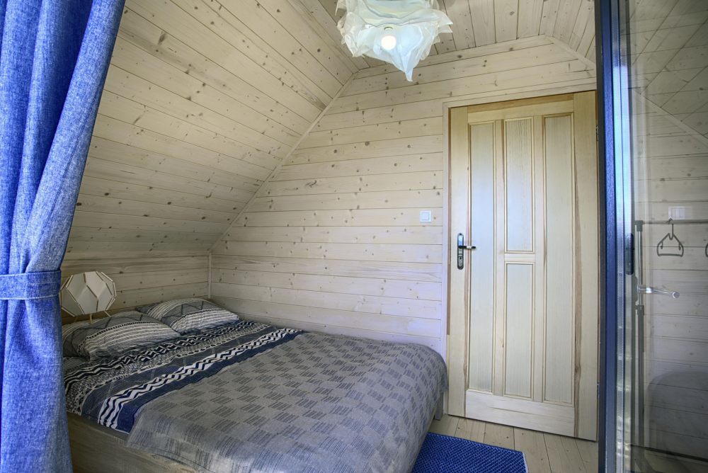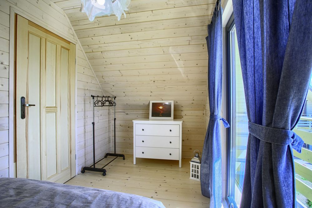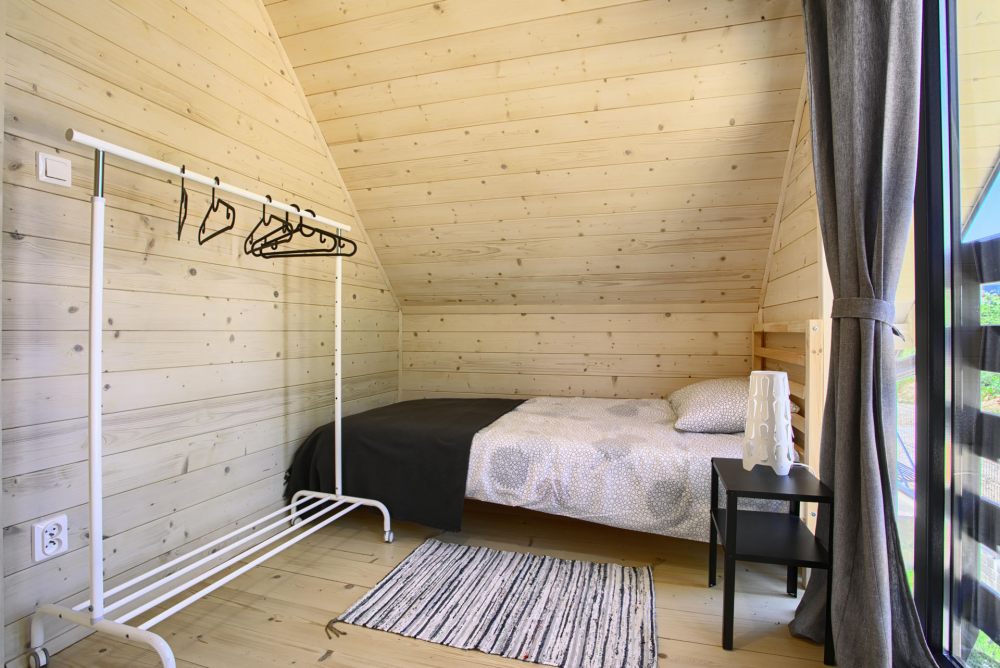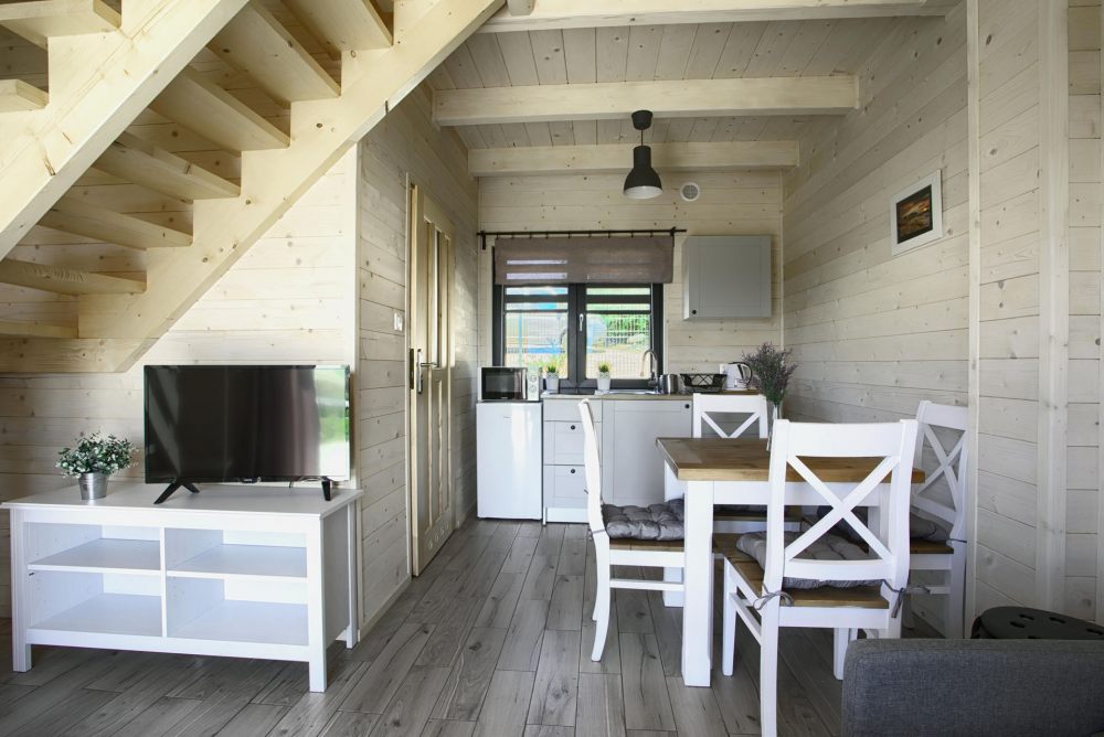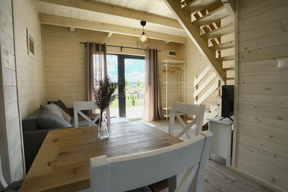 Każdy domek posiada 2 sypialnie na piętrze a także toaletę, na parterze pokój dzienny z aneksem kuchennym i łazienką z prysznicem.