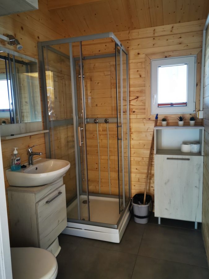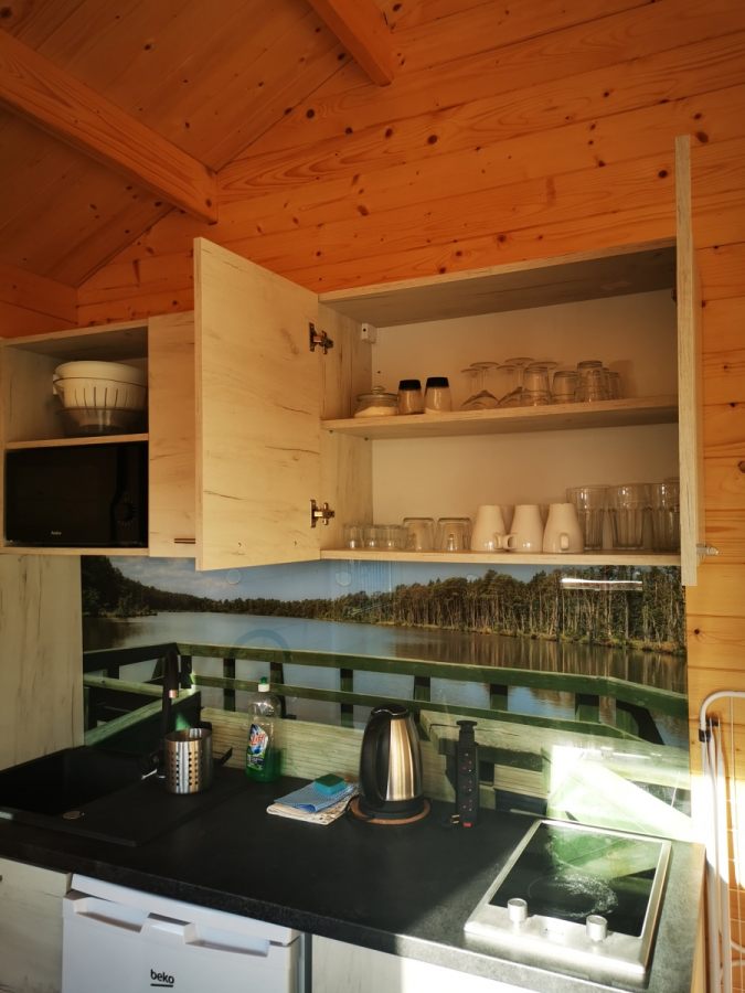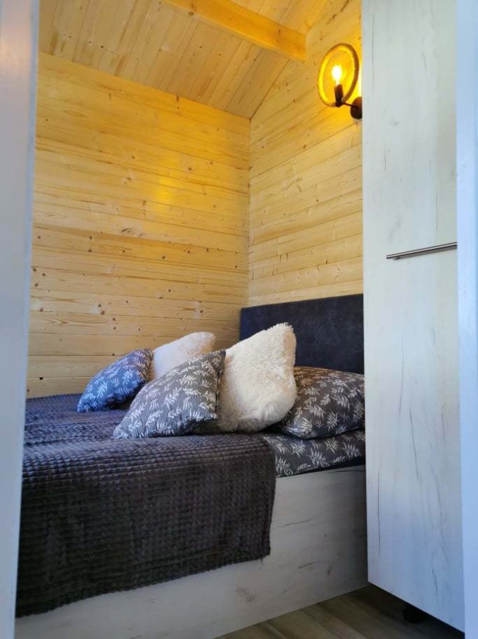 Każdy domek posiada osobną łazienkę, wygodna sypialnie i salon z aneksem kuchennym z pełnym wyposażeniem tj: