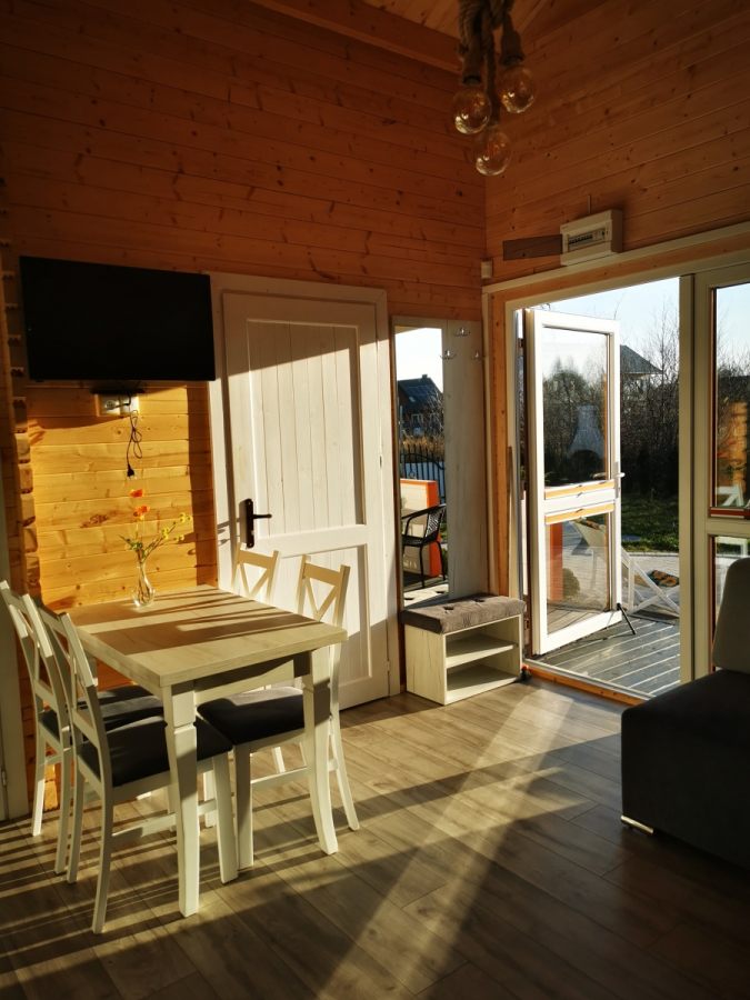 Domek 4-5 osobowy ma ok.35m2. W domku jest salon z aneksem kuchennym w zabudowie, z grafiką na ścianie z atrakcjami turystycznymi w Rowach. Salon ma dwie osobne kanapy, 140cm szerokości, stół, 4 krzesła, szafę na odzież, komodę, półki na ścianie, telewizor 32 cale. Domek posiada osobną sypialnię, wyposażoną w odrębną szafę na odzież, łoże małżeńskie z pikowanym zagłówkiem. Ma szafki nocne i piękną toaletkę w stylu Ludwika, z szufladką na drobiazgi i kosmetyki. W łazience są meble w zabudowie w stylu skandynawskim.
