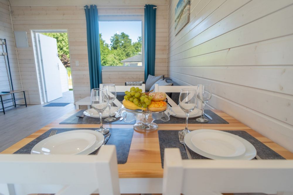 Domki max 6-7 osobowe. Każdy domek posiada aneks kuchenny - w pełni wyposażony, łazienkę, 2 osobne sypialnie, taras z grillem, 2 leżaki i parawan.