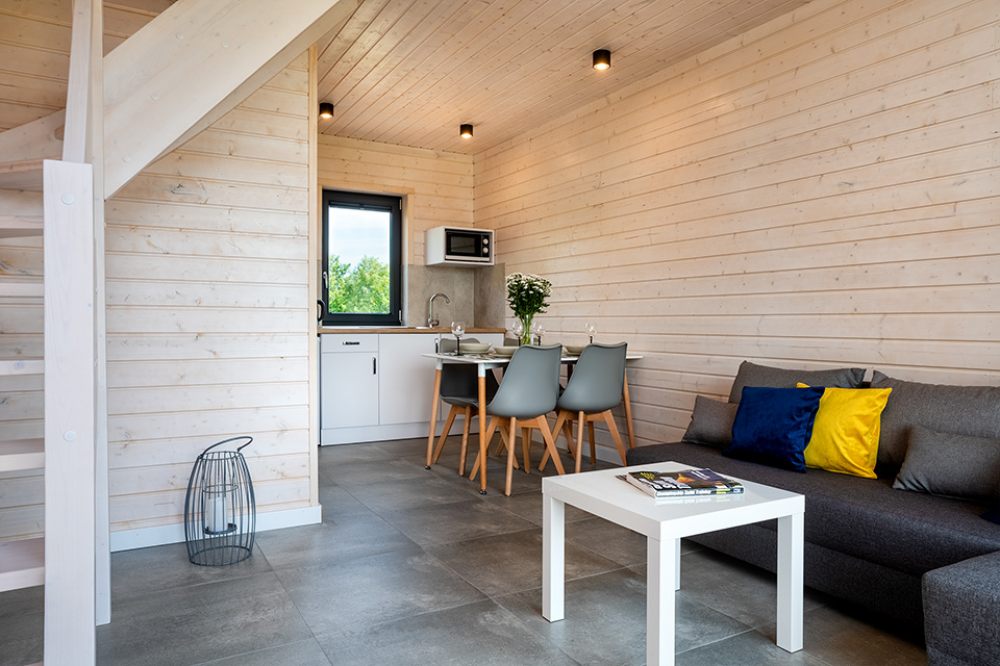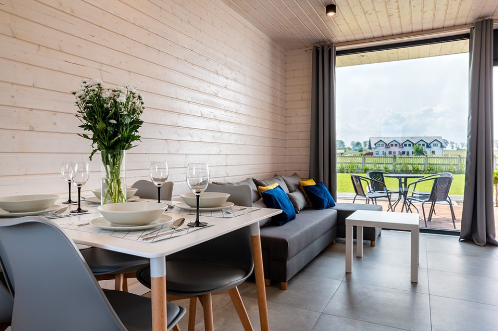 Do dyspozycji Naszych gości oddajemy 10 domków o powierzchni 42m2 wraz z tarasem 12m, który podczas dni słonecznych można przysłonić markizą.