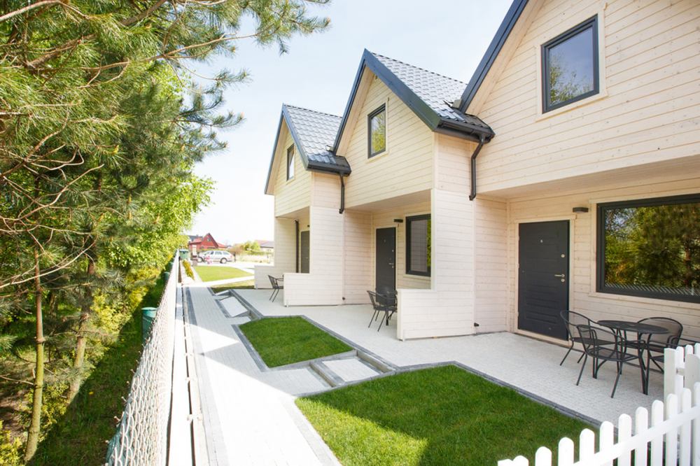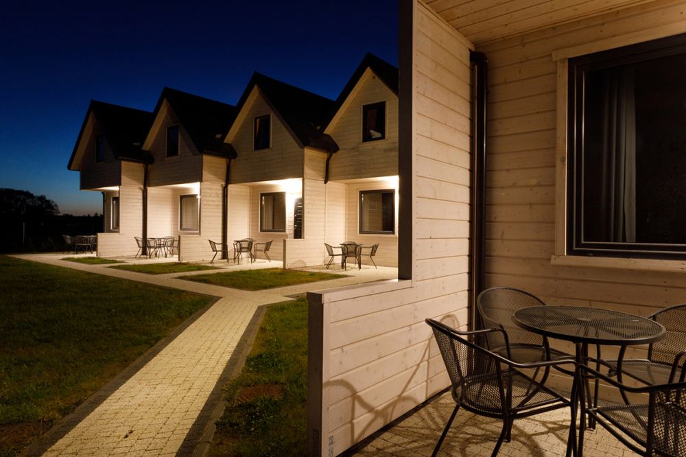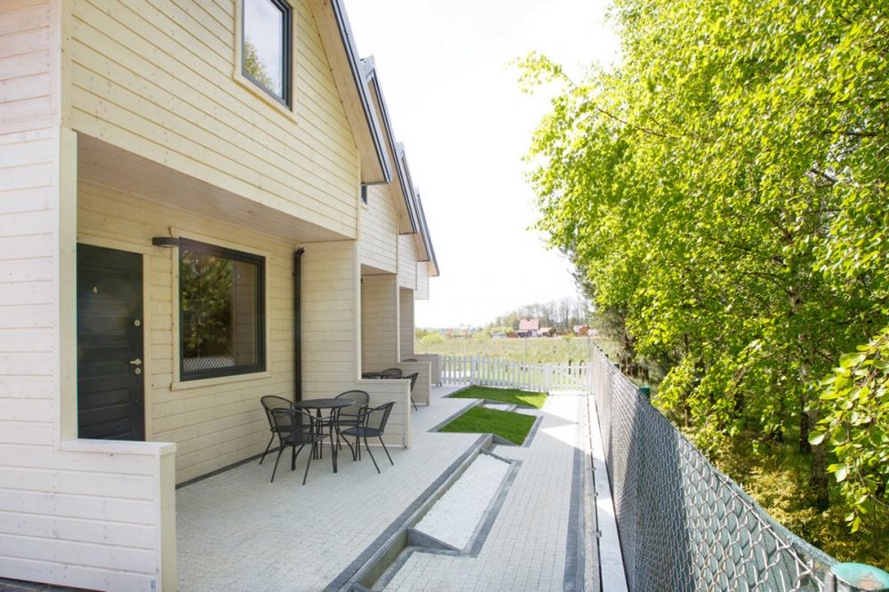 Na zewnątrz: przed każdym domkiem znajduje się taras z meblami ogrodowymi.