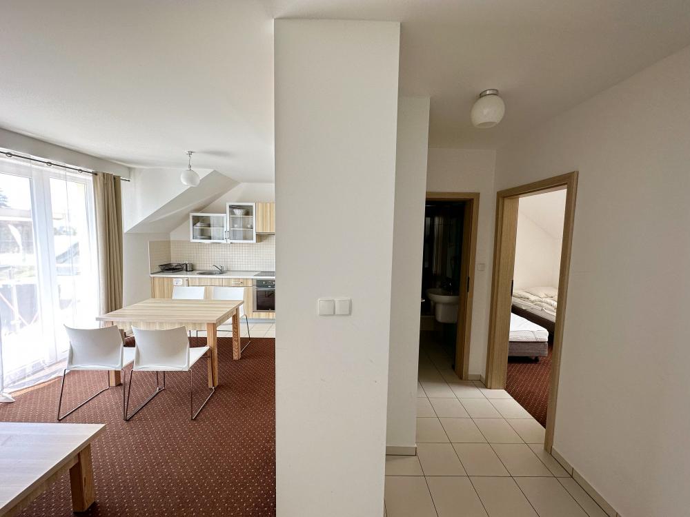 Apartamenty 2 pokojowe (4 - osobowe) - dla Gości, którzy cenią sobie większą przestrzeń oferujemy kompleksowo wyposażone ogrzewane apartamenty przeznaczone dla 4 osób. Ich powierzchnia wynosi 41 m2. W skład apartamentów wchodzą: przedpokój, salon z w pełni wyposażonym aneksem kuchennym, sypialnia, łazienka, taras lub balkon.