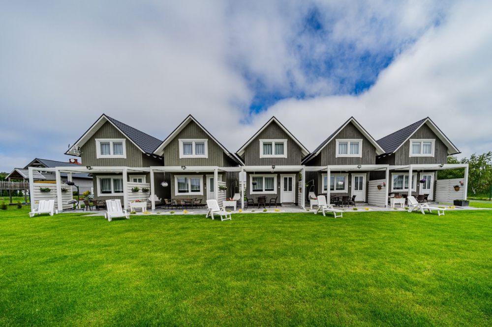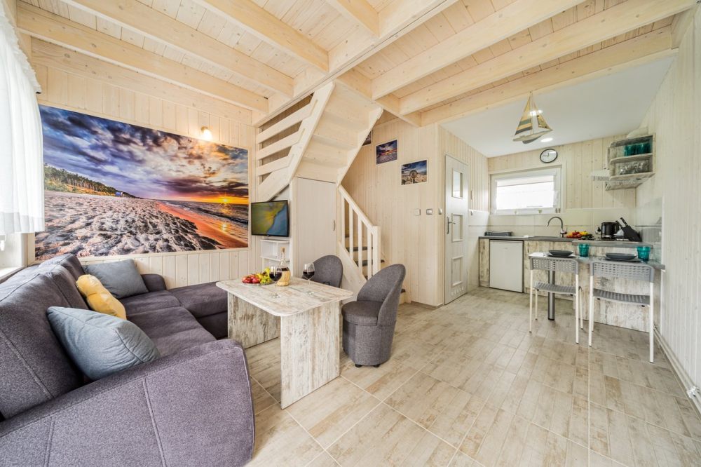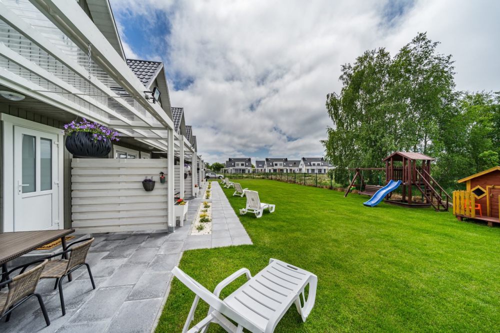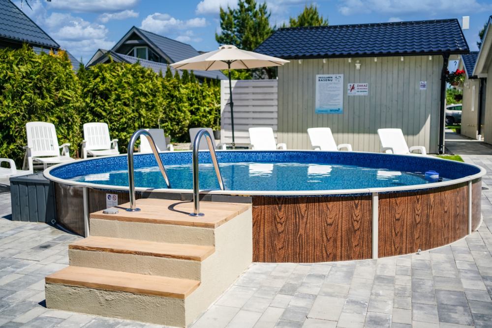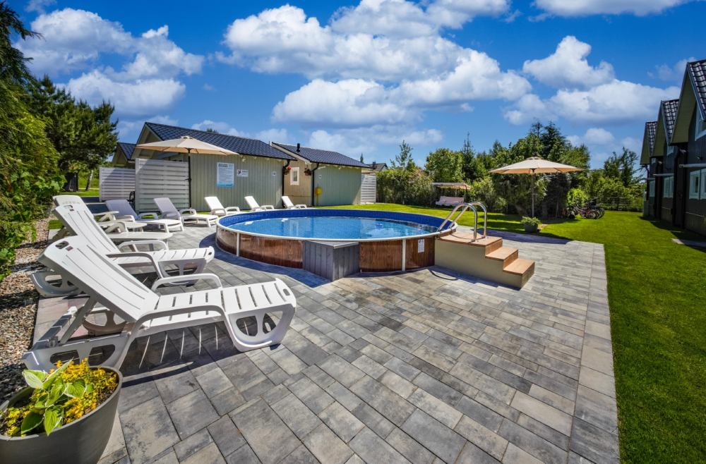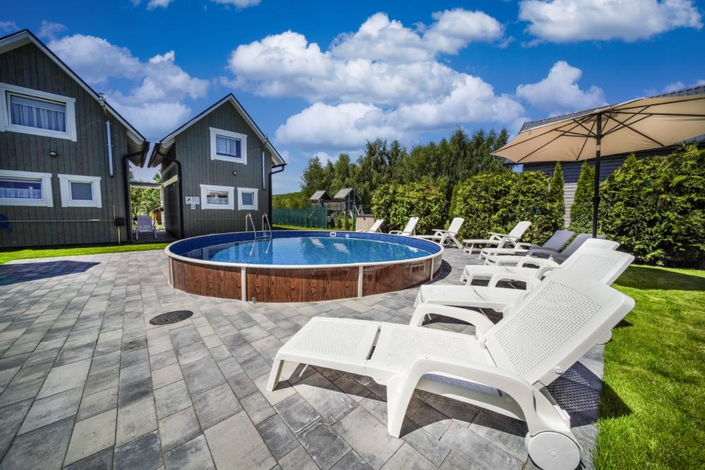Domki są całoroczne w stylu skandynawskim o powierzchni 50 m2. Przy każdym domku jest zadaszony taras z meblami ogrodowymi oraz miejsce do grillowania. Mamy duży zadbany ogród i plac zabaw dla dzieci. Basen na terenie obiektu na wyłączność dla naszych gości - średnica 5,50 m i głębokość 1,2 m.