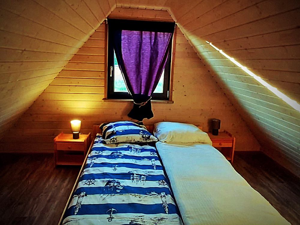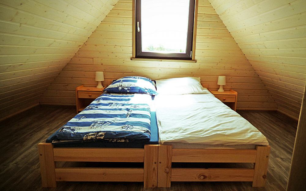 Na piętrze znajdują się 2 sypialnie wyposażone w łóżka, pościel oraz szafę.