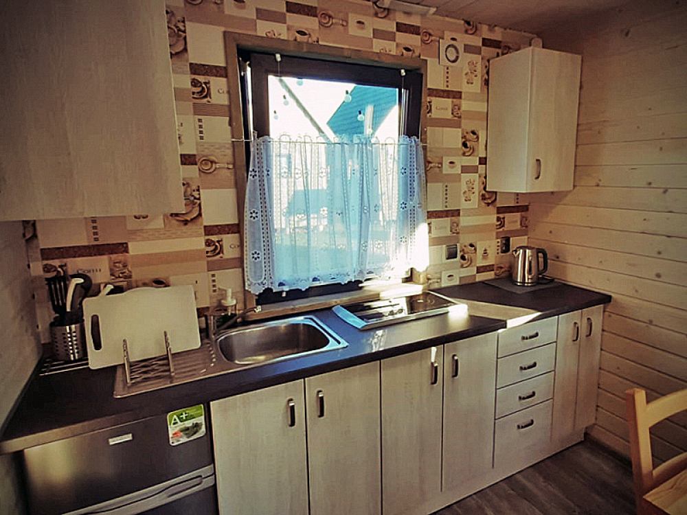 W każdym domku zapewniamy niezbędne do wygodnego pobytu wyposażenie, jak lodówka, płyta indukcyjna, czajnik, oraz naczynia.
